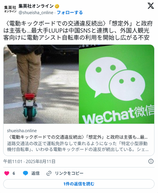 「想定外」と政府は主張も…最大手LUUPは中国SNSと連携し、外国人観光客向けに電動アシスト自転車の利用を開始し広がる不安