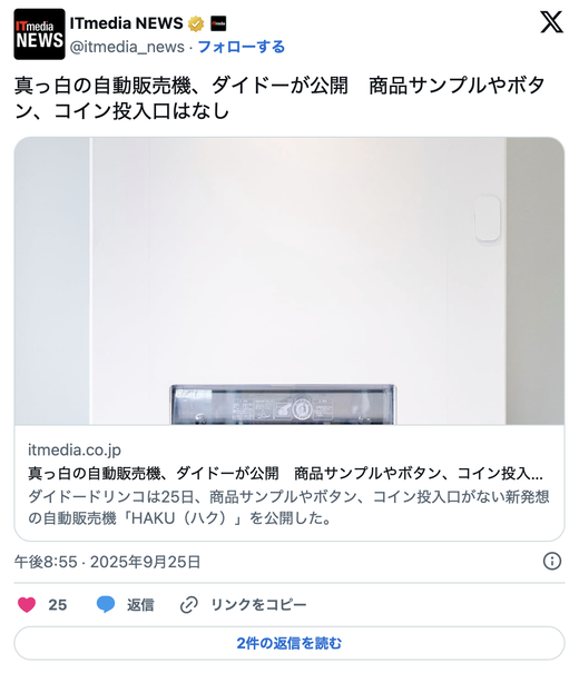 という事で、どういうことかというと、全面白の自販機で、スマホ画面からダイドーの飲み物を購入すると、自販機から飲み物が出てくる