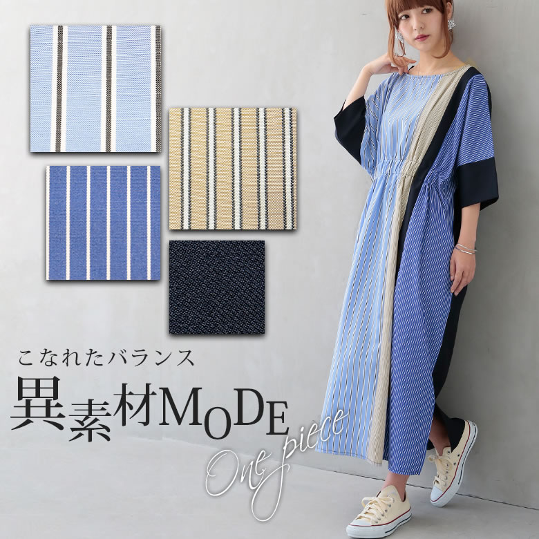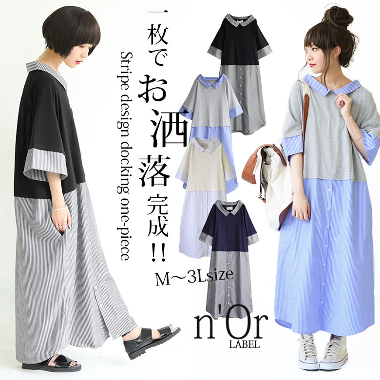 『n'Orストライプ切替ロングワンピース』【 ロングワンピース レディース 七分袖 ストライプ 異素材 アシメ アシンメトリー ウエスト切替 スリット おうちで洗える ノアール 】【メール便不可】楽天市場5,500円