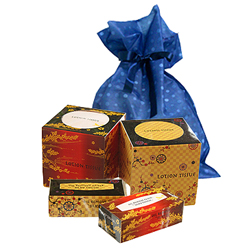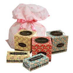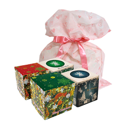 こんな感じのクリスマス柄のティッシュ4個セットなど5つのギフトセットが紹介されています。