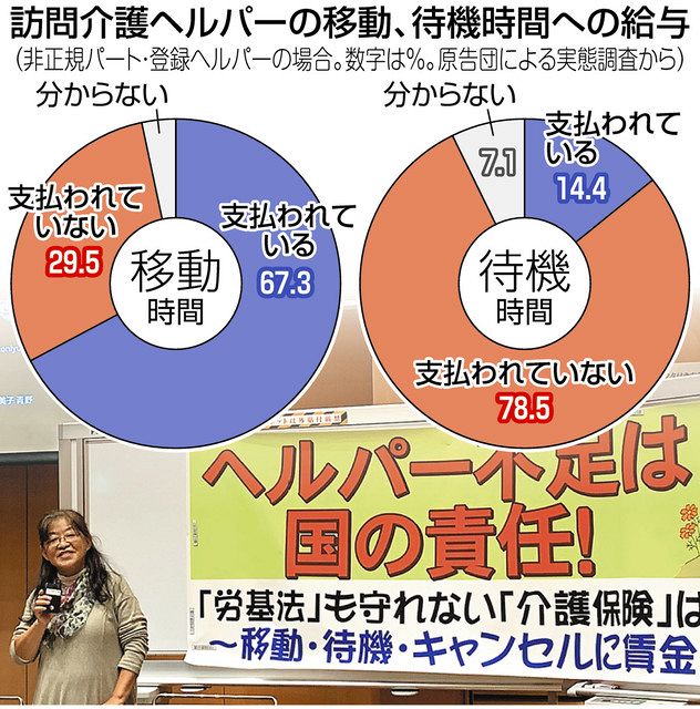 厚生労働省は、移動や待機時間などは労働時間として賃金を払うよう事業者を指導している。原告側は、これらの時間に事業者が給与を払えるだけの介護報酬を国は設定していないと訴えたが、国側は報酬の算定の根拠も含めて答えないまま。ヘルパーの労働実態について「調査していない。今後もしない」と答えた。(文中より)