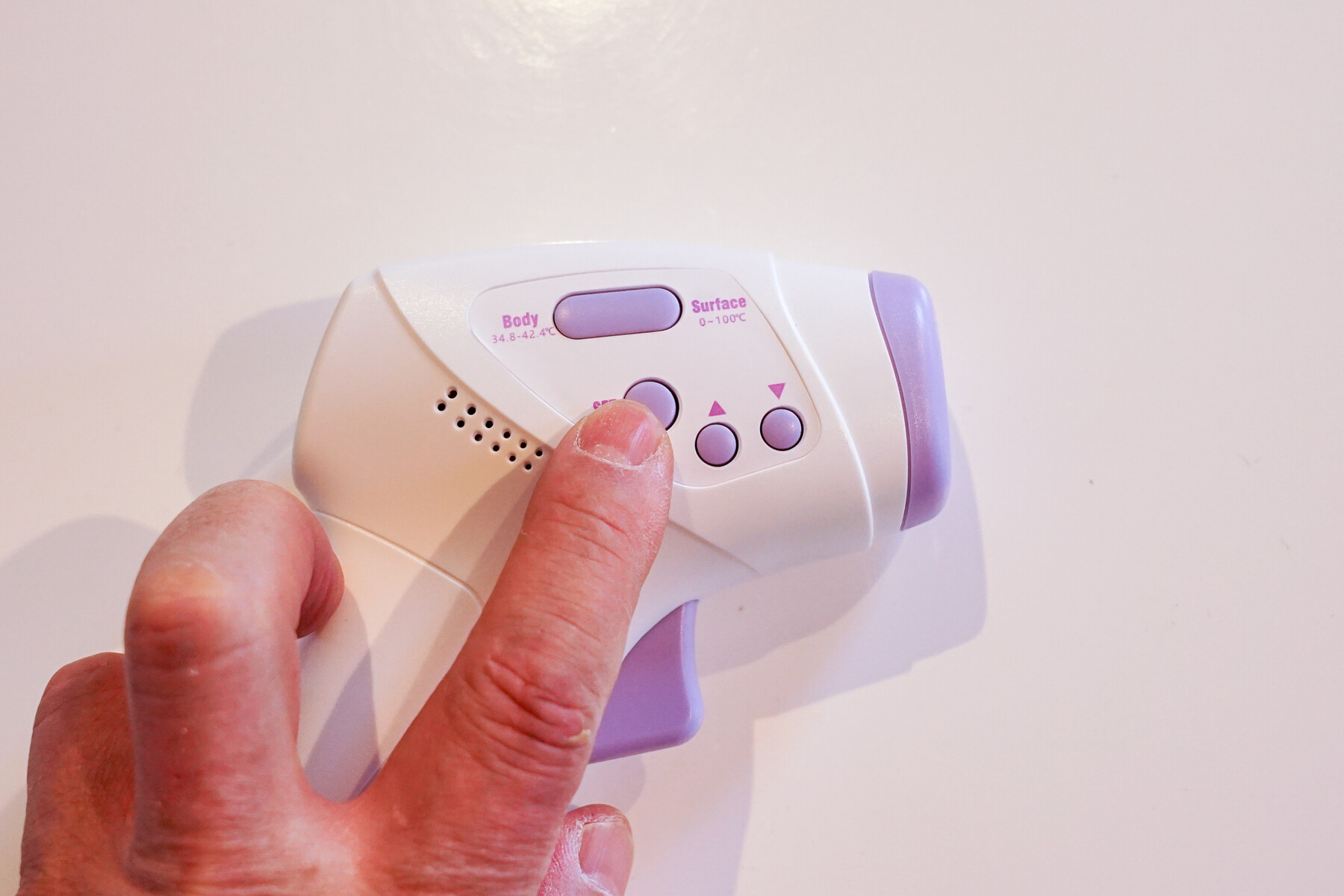トリガーを引けば仕様通り 1 秒ほどで計測が完了します。また、Body (人体)/Surface (表面) 切り替えボタンを押すと、その度にBody (人体) とSurface ( 表面) モードが切り替わります。計測では基本的にこの操作以外は一切必要なく非常に簡単です。私は、Bodyで使っています。