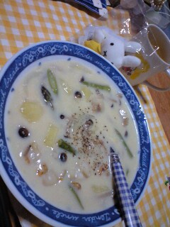 相変わらずいっぱい☆シチューです!ジャガイモ玉ねぎアスパラしめじホタテ……具材入れすぎ(笑)スープ部分が少なし。そしてこうなる。こりゃ、クリーム煮。コクが欲しくて、チーズもプラス。明日はグラタンかなぁ。旨し!!(自画自賛(笑)したっけねん♪