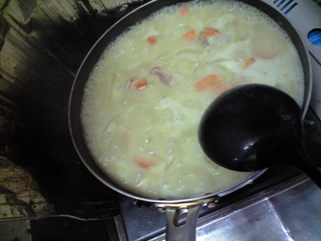 こんな時間にホワイトカレー作ってみました~材料買って、なかなか作れなかったので。焦げ付きやすい鍋しかなくて、フライパンでつくってまふ(笑)テフロンのちょうどい~サイズの鍋ないかしら。フライパンでも、あんまし不自由してなかったりして(笑)今年は、土鍋ほしいなぁ~なんかこう、3、4人用で田舎な感じのが。実は、めぼしはつけてるのさ(笑)買っちゃお~っと。したっけね~