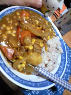 昨日の事は食後に。暑いし夏バテ防止にと、カレー。中辛のルーだから、コーンを入れて甘くしよう。粒マスタードが余ったから入れちゃえ。飲まない赤ワインも。なんとも具だくさんな濃厚なお味。何食分かなぁ…したっけね~