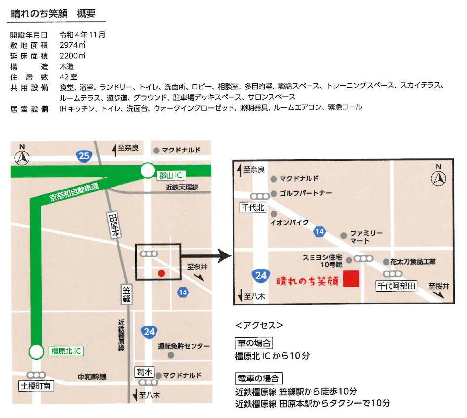 ※「晴れのち笑顔」は、磯城郡田原本町、三宅町、川西町を中心に、桜井市、橿原市、天理市、大和高田市、北葛城郡広陵町など、周辺地域で地域密着型の介護施設をお探しの方に最適なサービスです。