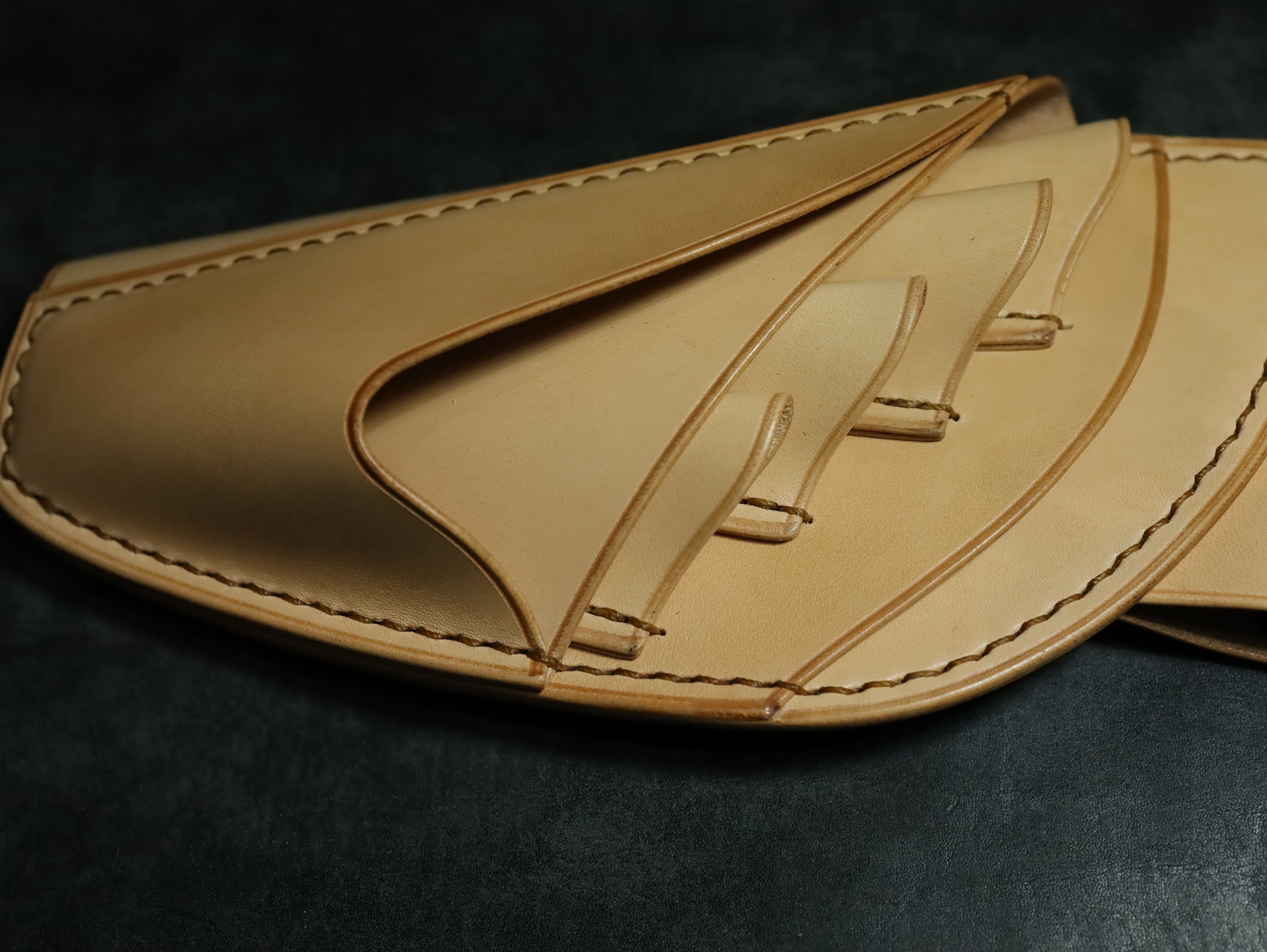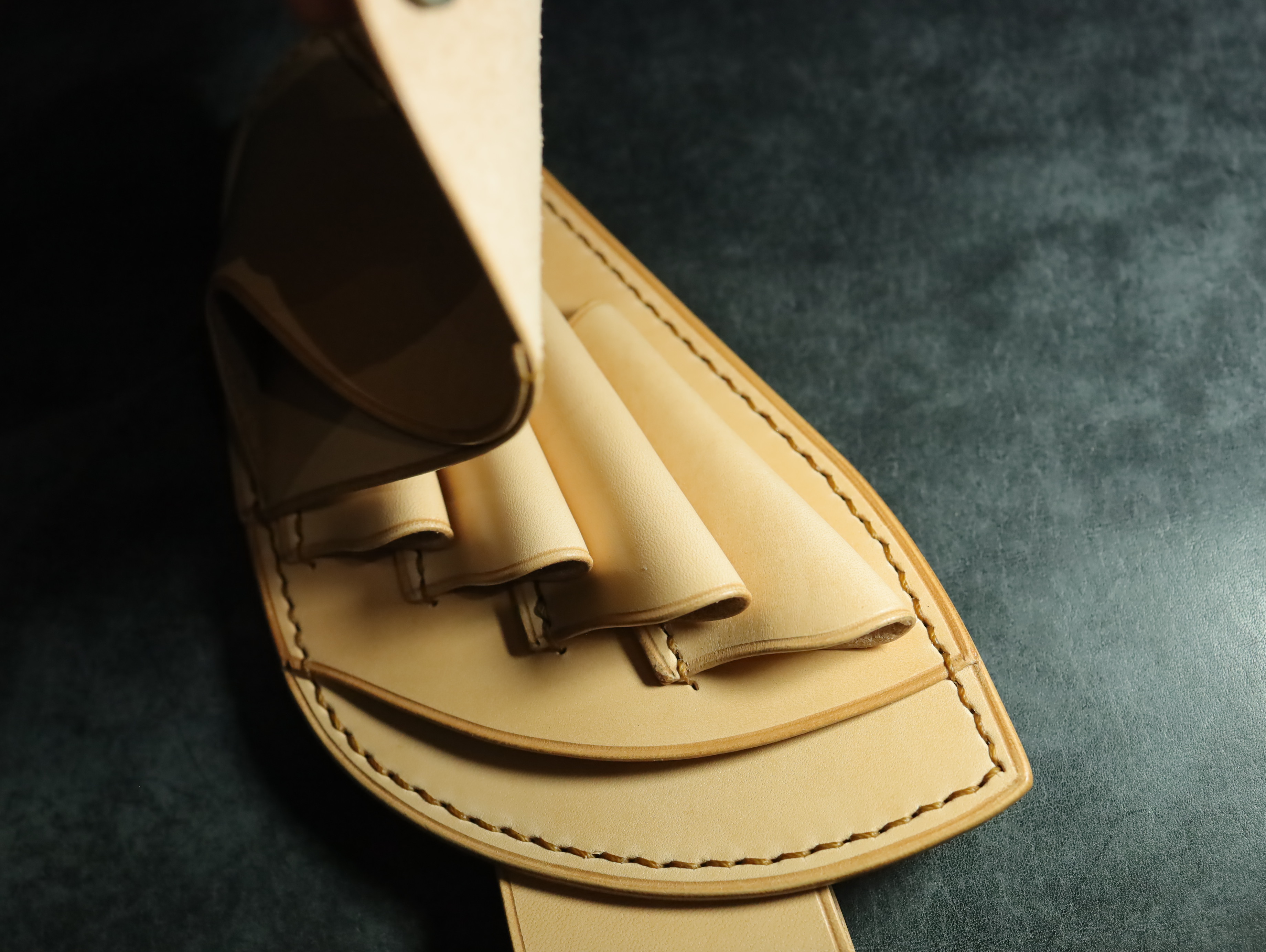 縁部分に焼き入れをして、革を縮め硬くして耐久性をアップしております