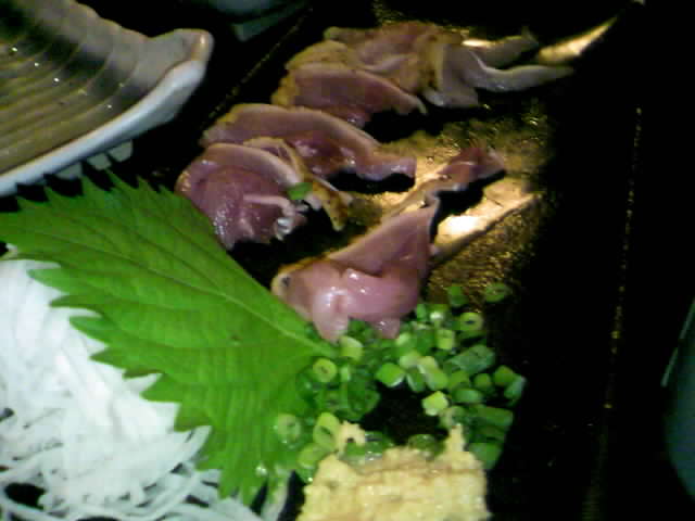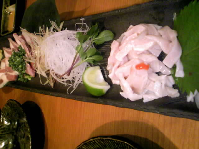 薩摩地鶏を使った、モモと胸肉、肝の刺身と