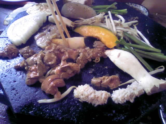 で、ホテルに戻って着替えて、これまたすぐ、腹が減り過ぎらしいので、晩飯を食いに、溶岩焼のある