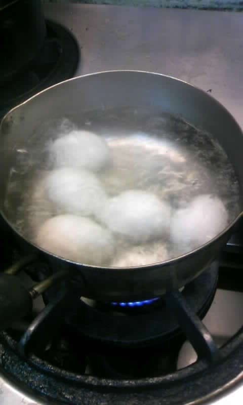 2)ご家庭にある中位の鍋に水を7分目位大体1.5L位、玉子が少し浮く程度水を入れて沸して下さい、5、6分で沸きます。