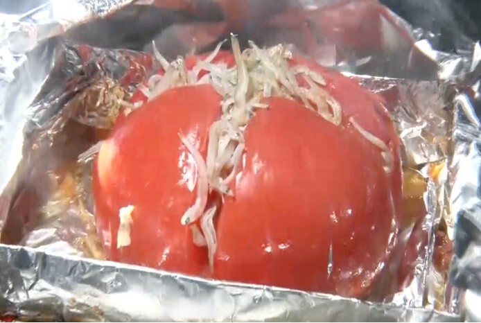 2.トマトの切り込みを入れ、そこにちりめんじゃこを入れ、