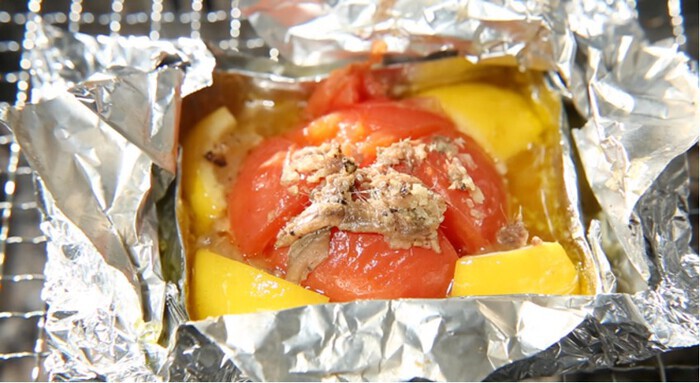 3.ホイルで包んで火の上にのせ、くずれるまで15〜20分焼く