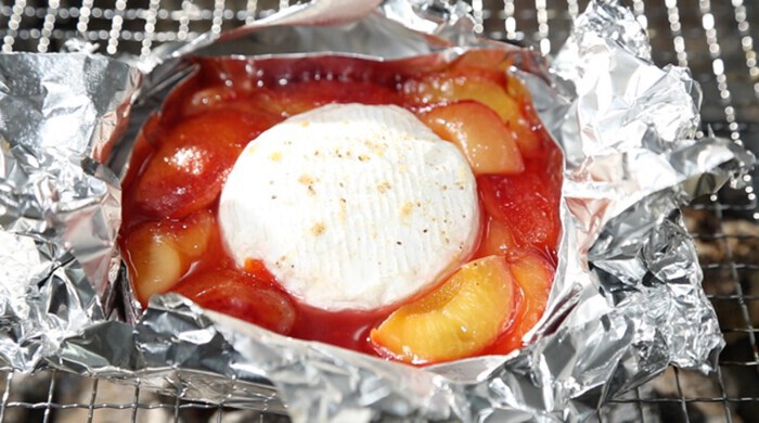 1. ホイルで箱を作りカマンベールチーズをのせ、プラムを入れ、