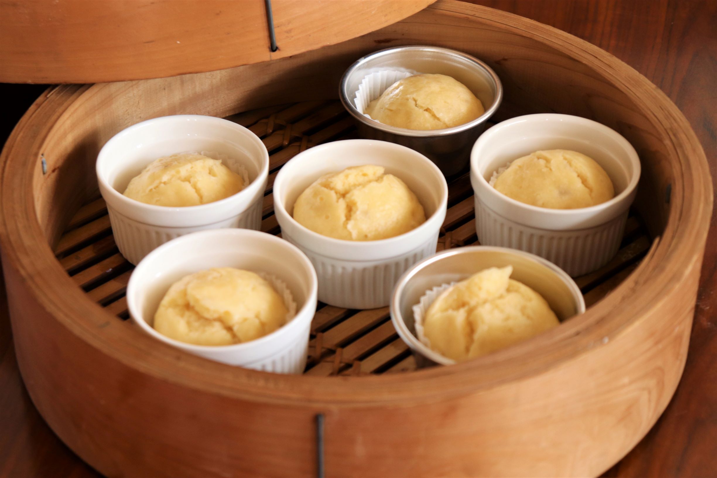 - 耐熱容器にベーキングシートを敷き、8分目まで生地を入れ、中火の弱火で10分ほど蒸す。串を刺し、生の生地がついてこなければ完成。
