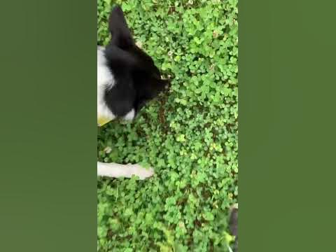 を草の中に隠して探させると、すぐにニオイを認識したようす。