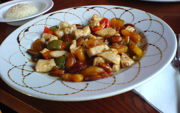 鶏肉のぶつ切りに、アーモンド、アプリコット、レーズン