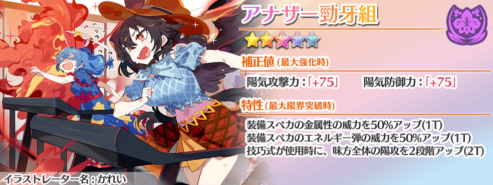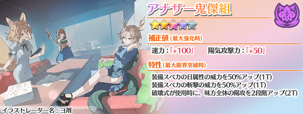 特攻はスペカと同様、人間妖怪神格霊魂の広い特攻、初段250%の高い斬烈弾、加えてスペカ1効果で積んだ速力Ⅱがあればラスゲの敵を蹴散らしてくれる...と良かったのですが残念ながら陽防デバフと命中関係が自力、適正絵札ではどうにもならないので少し補助が必要になります。