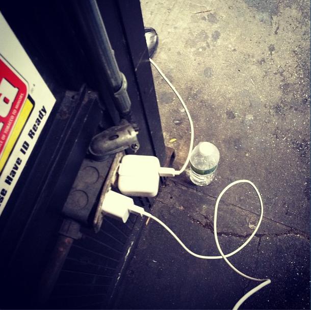 2. チェース銀行のロビーのコンセントで充電するために集まる人々