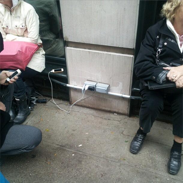 今も昔も変らぬ「モバイラー」達が、大都会ニューヨークの路上で電源とWi-Fiを探しまわっている大勢の人々の写真です。