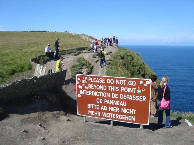 18. 「路肩(ショルダー)に立つな」の標識の横で肩の上に立つ男