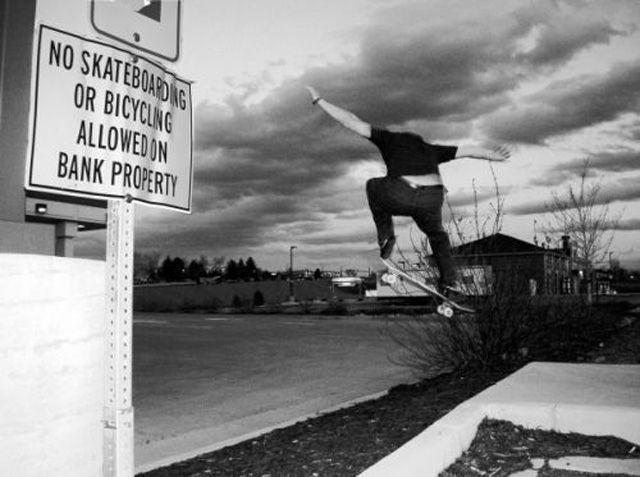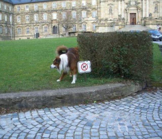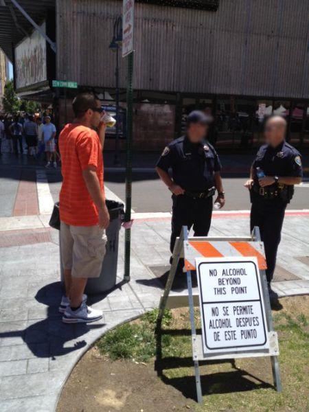 19. アルコール禁止の標識の前、しかも警察官の前で一杯引っ掛ける男