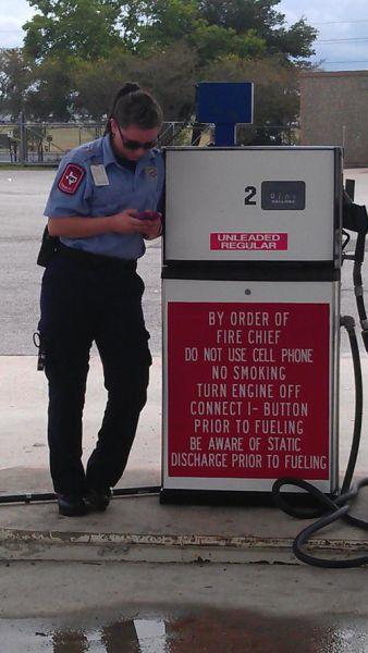 16. 「消防署の指導により携帯電話禁止」の横で警察官が……