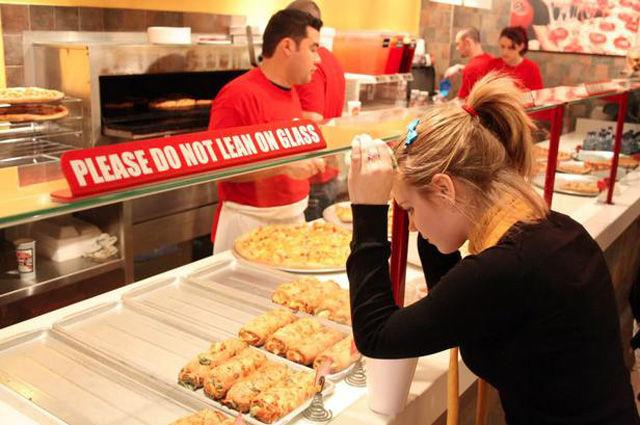 25. 「ガラスに寄りかからないでください」の前で真剣に悩む女性。