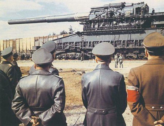 2. 第二次世界大戦中にドイツ陸軍が実用化した世界最大の列車砲「グスタフ」をみつめるヒトラー総統(1942年)