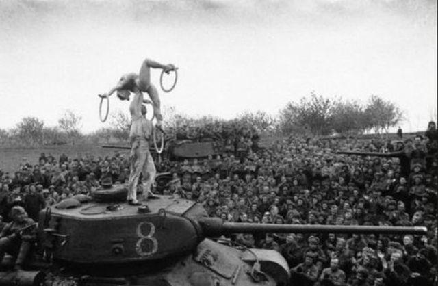 29. ベルリンで戦争の合間に行われたアクロバットショーに集まるソビエト兵たち(1945年)