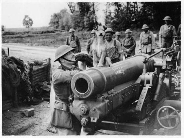 32. 第一次世界大戦中、砲手たちに囲まれて大砲の上に座っている犬