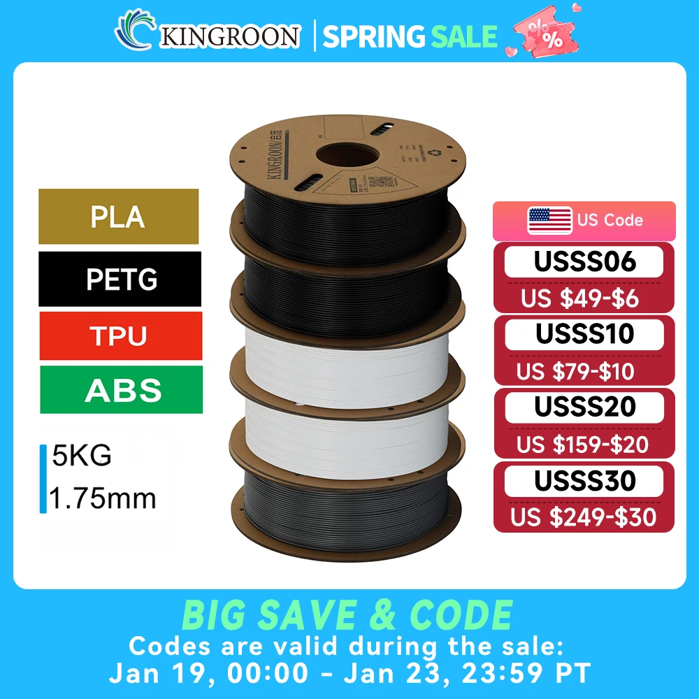 KINGROON 3D Printer Filament PLA PETG TPU ABS 5KG Bundle Black White Gray 1.75mm No bubbles Plastic 5 roll 1kg , Random Spool