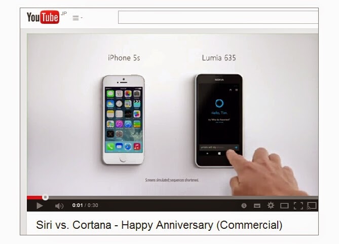 Microsoftが公開した新CMは、189ドルのLumia 635に搭載されるCortanaが次々とユーザーの命令を受け入れるのを見て、iPhone 5sのSiriが「あれこそが“スマート”フォンですね」とつぶやくというストーリー。