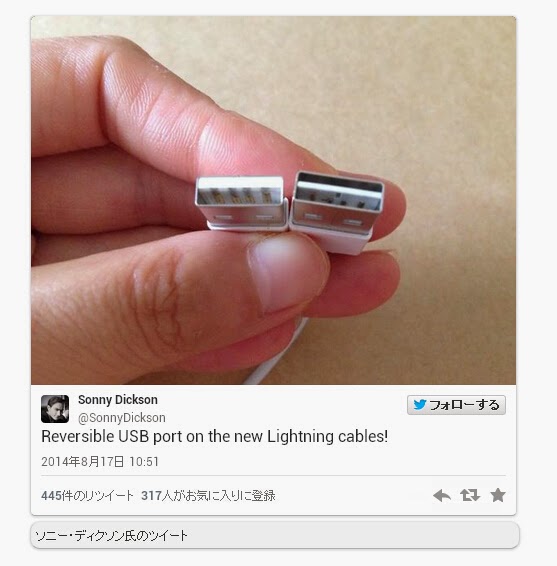 米Appleが9月9日(現地時間)に発表されると見られている次期iPhoneに付属するLightning-USBケーブルのUSBコネクタは独自のリバーシブルなものになる──。Apple製品のうわさサイトを運営するソニー・ディクソン氏が新ケーブルだとして画像をツイートした。