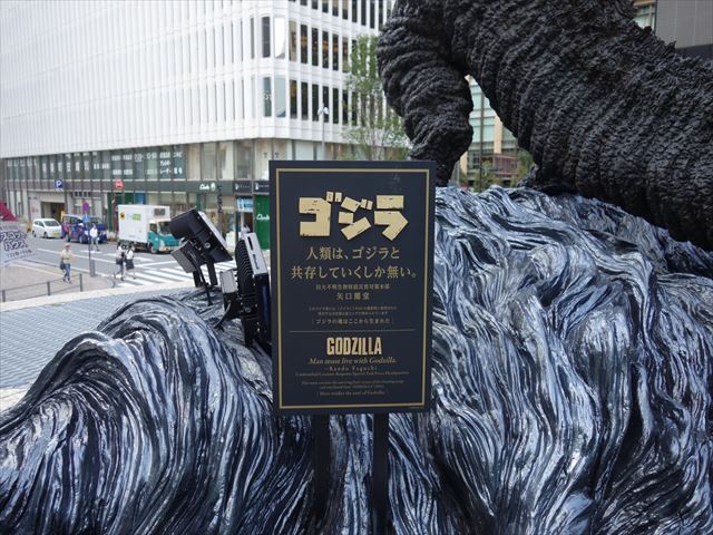ゴジラ像の足元にある説明版。映画「シン・ゴジラ」に出てくる巨大不明生物特設災害対策室の矢口蘭堂氏の言葉「人類は、ゴジラと共存していくしか無い」が刻まれています。このゴジラ像の下に、1954年の映画「ゴジラ」の撮影時に使用された現存する決定稿と絵コンテが納められているそうです。