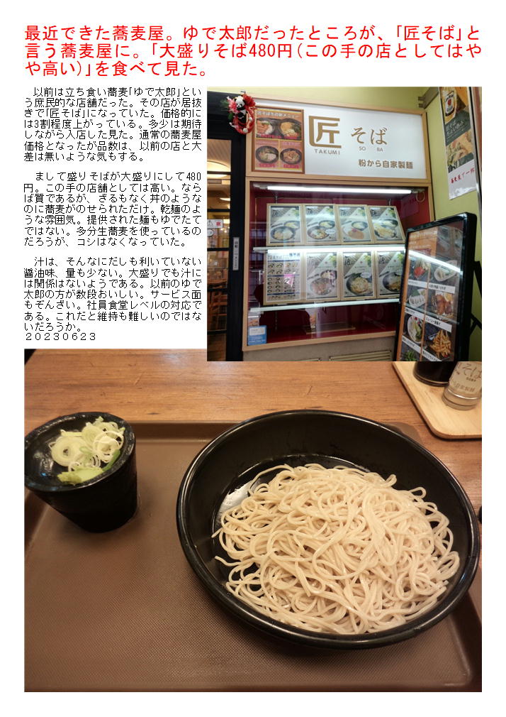 以前は立ち食い蕎麦「ゆで太郎」という庶民的な店舗だった。その店が居抜きで「匠そば」になっていた。価格的には3割程度上がっている。多少は期待しながら入店した見た。通常の蕎麦屋価格となったが品数は、以前の店と大差は無いような気もする。