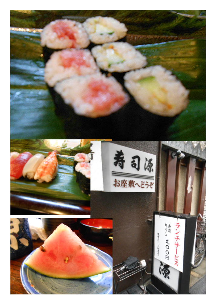 巻物は「鉄火」、ネギトロのようなものが具材となっていた。「カッパ」は、梅じそ風味、ごまも入っていて香ばしさも感じた。当然その都度に作られたもの、海苔の海もよかった。終わりと思い会計を確認すると、なんとデザートのサービス、大きめのスイカ。私は初物となった。やはり老舗!