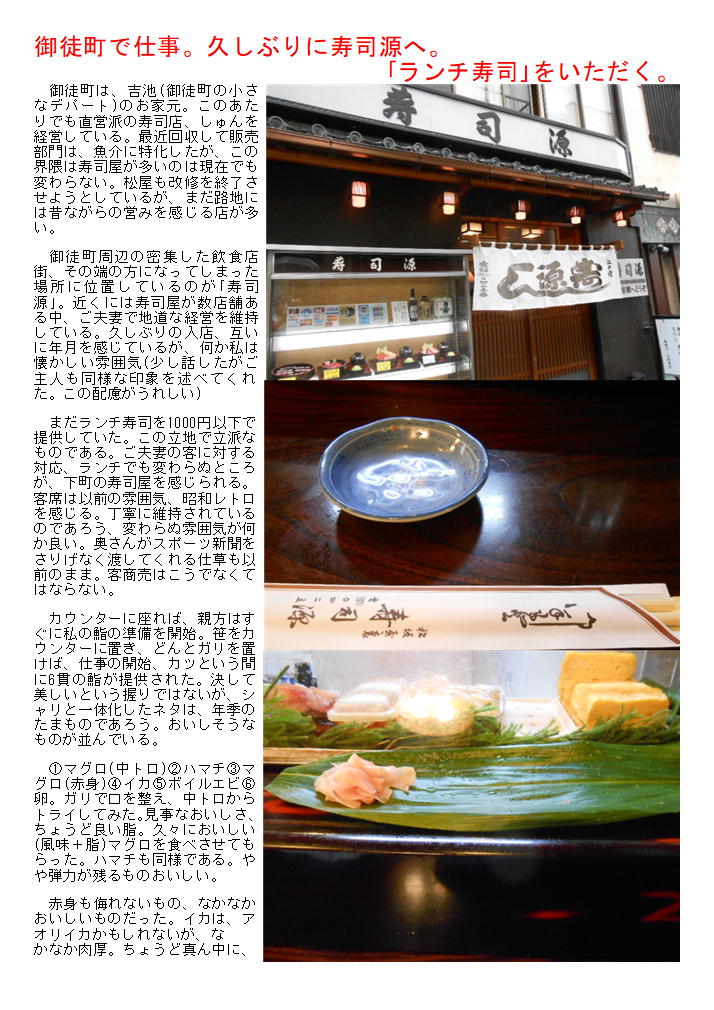今日は、御徒町。以前食べたことのある老舗「寿司源」に行ってみた。記憶では、年季の入った親方が一人で切り盛りする店舗。今日は奥さんらしい方が手伝っていた。そうか鮨屋は、静かな雰囲気で食べられるというのも私がうかがう理由かもしれない。
