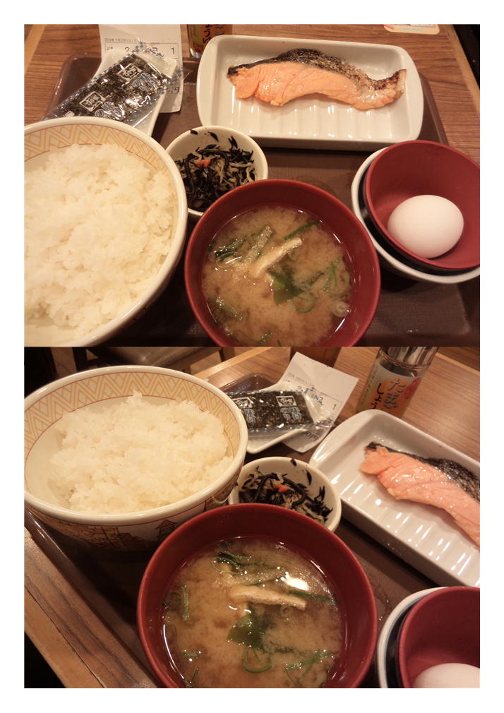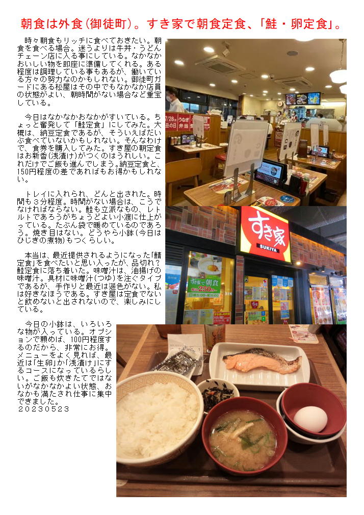 朝食は外食(御徒町)。すき家で朝食定食、「鮭・卵定食」。