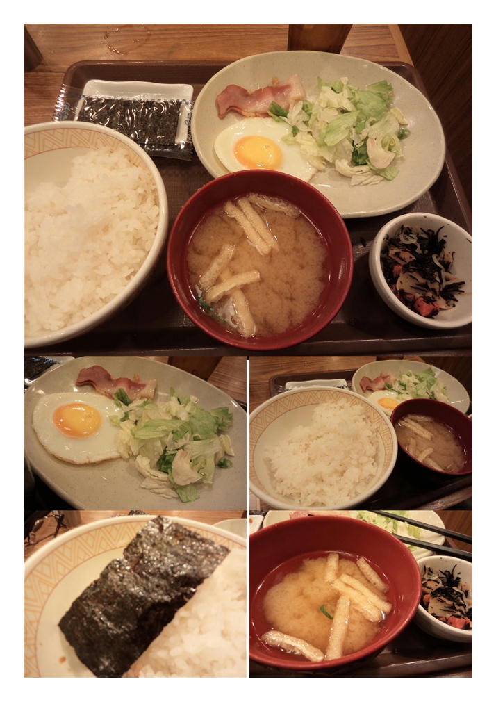 どうにか400円以内に納めた朝定食。①ベーコンエッグ(目玉焼き+ベーコーン)+サラダ②海苔(3枚)③小鉢(ひじきの煮物)④ごはん⑤味噌汁がつくのだから十分。納豆追加とも思ったが110円程度追加になり、これでは500円定食、我慢をすることにした。