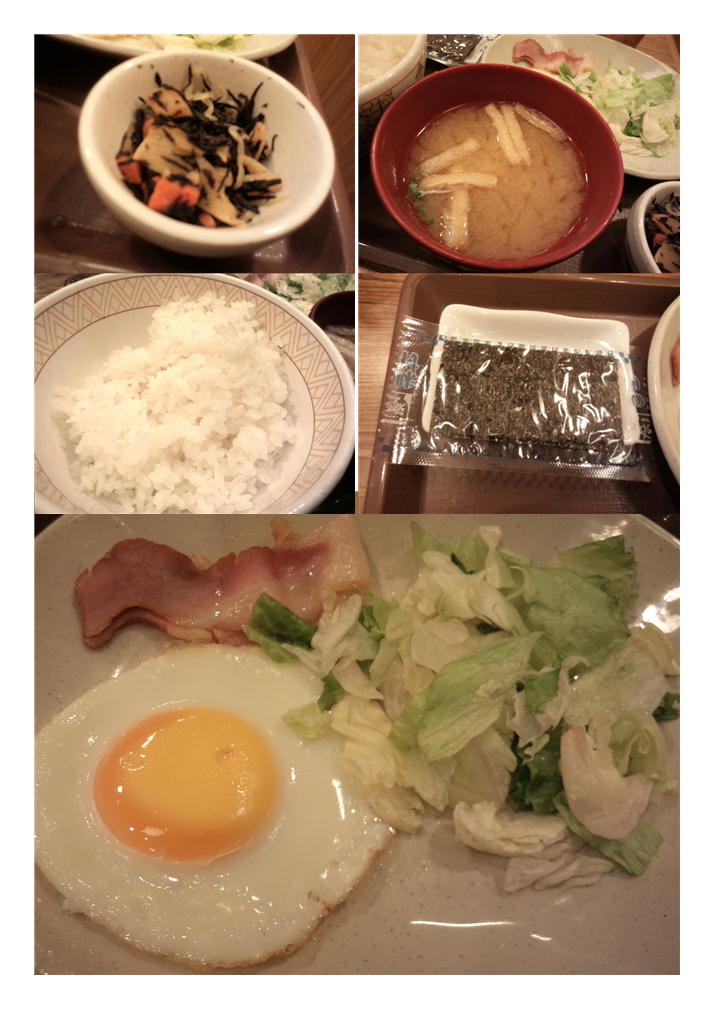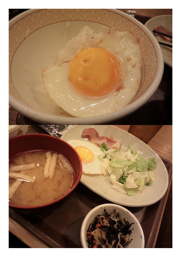 朝食は外食(御徒町)。すき家で朝食定食、「ベーコンエッグ定食」。