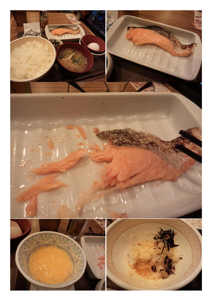 トレイに入れられ、どんと出された。時間も3分程度。時間がない場合は、こうでなければならない。鮭も立派なもの、レトルトであろうがちょうどよい小渡に仕上がっている。たぶん袋で暖めているのであろう。焼き目はない。どうやら小鉢(今日はひじきの煮物)もつくらしい。