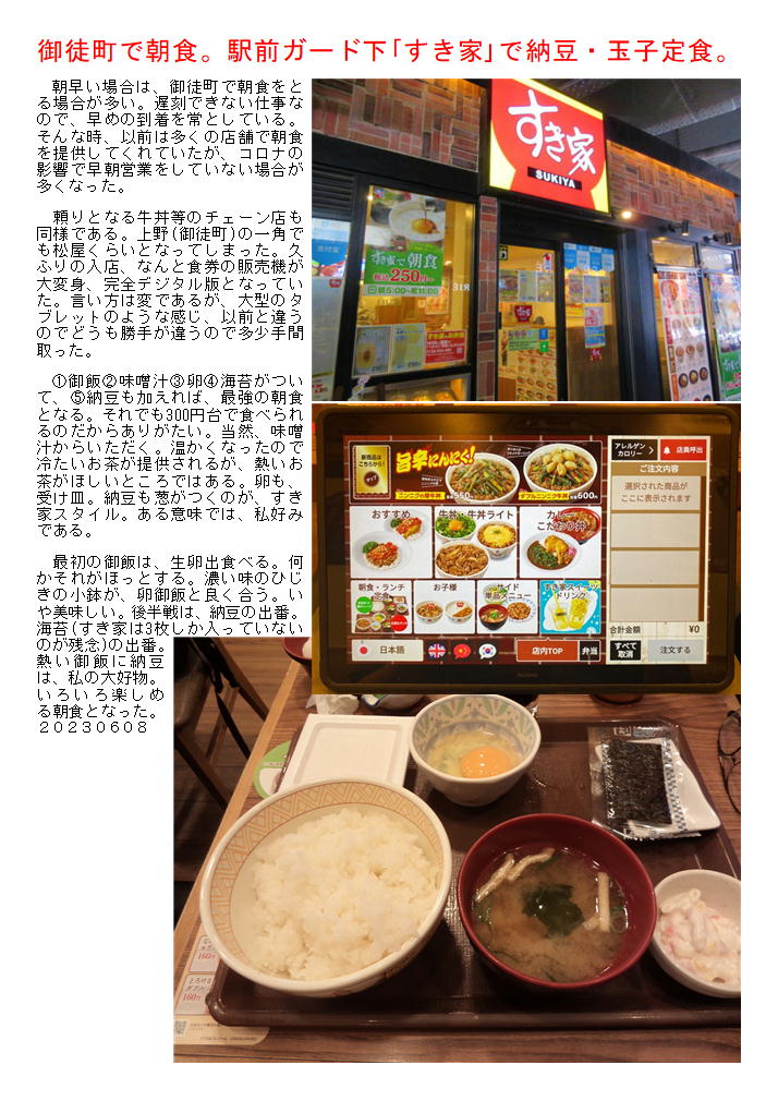 御徒町で朝食。駅前ガード下「すき家」で納豆・玉子定食。
