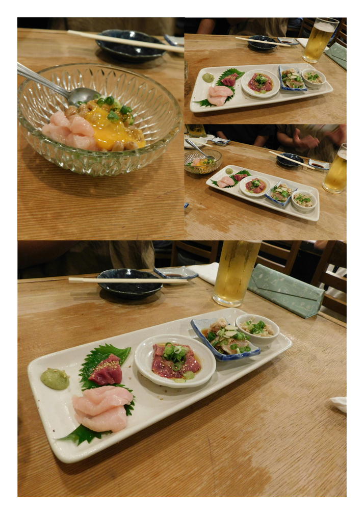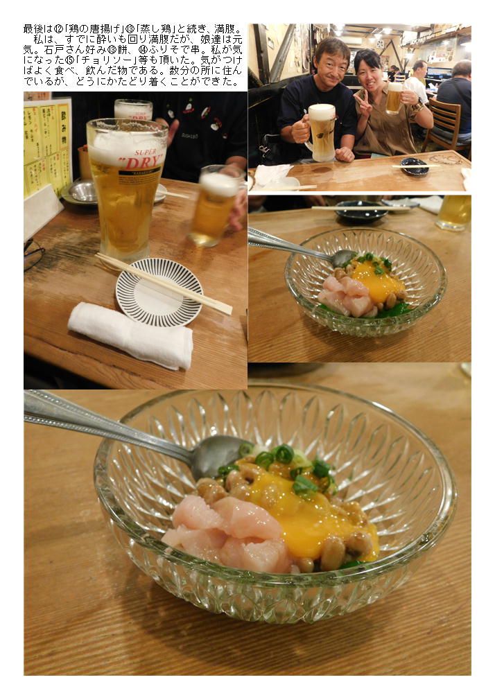 まずきビールだか、大(メガジョッキ)があったので、石戸さんとともにチャレンジしてみた。聞けば、ほぼすべての飲み物がメガにできるらしい。娘の生中と比較しても大きな物だと解る。いつも食べると言う①「鳥刺しと納豆」を娘が注文していた。きれいな鶏肉と納豆、ミスマッチの感もあるが実に相性が良い物だった。