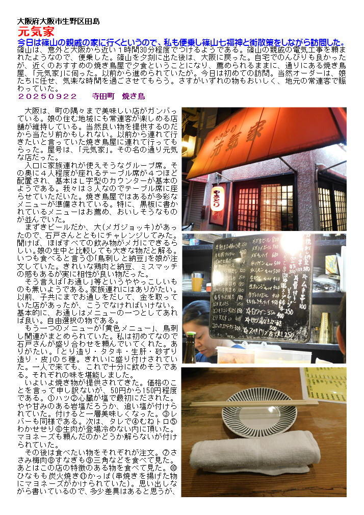 篠山は、意外と大阪から近い1時間30分程度でつけるようである。篠山の親戚の電気工事を頼まれたようなので、便乗した。篠山を夕刻に出た後は、大阪に戻った。自宅でのんびりも良かったが、近くのおすすめの焼き鳥屋で夕食ということになり、薦められるままに、通りにある焼き鳥屋、「元気家」に伺った。以前から進められていたが。今日は初めての訪問。当然オーダーは、娘たちに任せ、気楽な時間を過ごさせてもらう。さすがいずれの物もおいしく、地元の常連客で賑わっていた。