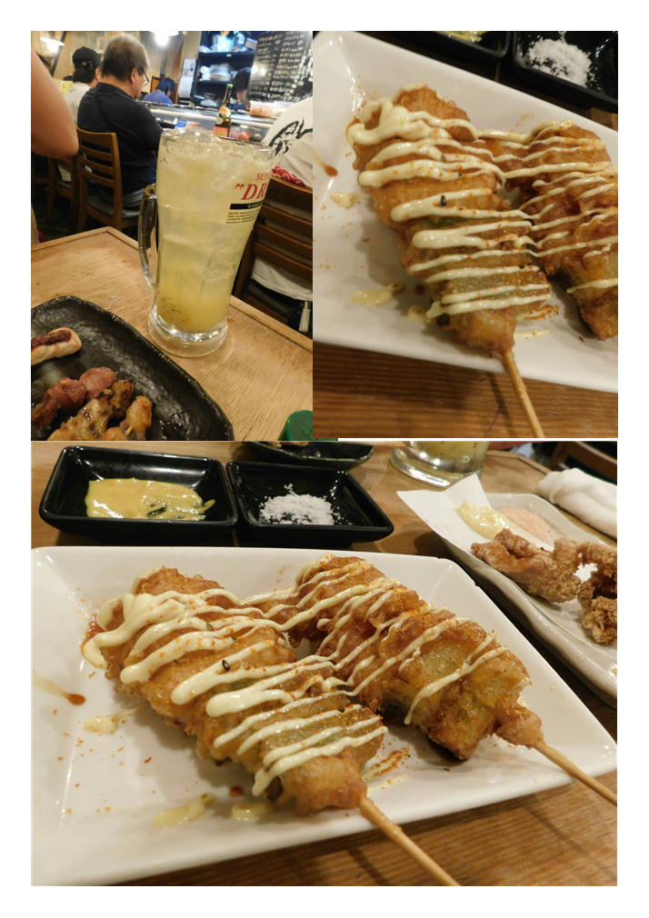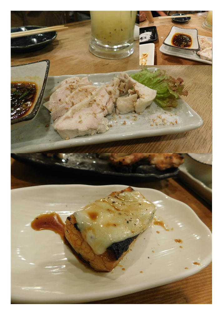 その後は食べたい物をそれぞれが注文。⑦ささみ梅肉⑧すなぎも⑨三角などを食べて見た。あとはこの店の特徴のある物を食べて見た。⑩ひなもも炭火焼き⑪かっぱ(串焼きを揚げた物にマヨネーズがかけられていた)。思い出しながら書いているので、多少差異はあると思うが、最後は⑫「鶏の唐揚げ」⑬「蒸し鶏」と続き、満腹。