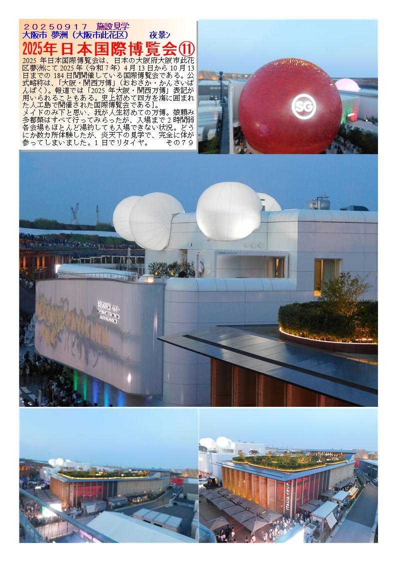 私の情報は、facebook twitter. を確認ください。「中華街を大切にする人」「ご利用する人」にはご協力をします。質問があれば、コメント欄 or sosamu@ya2.so-net.ne.jp にご連絡ください。中年おじさんの散策part2-2 から移行しています中華街の魅力は楽天ブログに今後移行していく予定です。https://plaza.rakuten.co.jp/sosamu02d/データーはライブドアーブログに掲載します。「中華街の魅力」https://sosamu02dhide.livedoor.blog/以前のデーターはアメバブログに移行しています。中華街の魅力中華街のいろいろなことを述べていきます。お問い合わせは、sosamu@ya2.so-net.ne.jp までお願いします。20250917 施設見学大阪市 夢洲(大阪市此花区) 2025年日本国際博覧会⑪2025年日本国際博覧会は、日本の大阪府大阪市此花区夢洲にて2025年(令和7年)4月13日から10月13日までの184日間開催している国際博覧会である。公式略称は、「大阪・関西万博」(おおさか・かんさいばんぱく)。報道では「2025年大阪・関西万博」表記が用いられることもある。史上初めて四方を海に囲まれた人工島で開催された国際博覧会である]。メイドのみ下と思い、我が人生初めての万博。娘頼み多都築はすべて行ってみらったが、入場まで2時間弱各会場もほとんど湯約しても入場できない状況。どうにか数カ所体験したが、炎天下の見学で、完全に体が参ってしまいました。1日でリタイヤ。