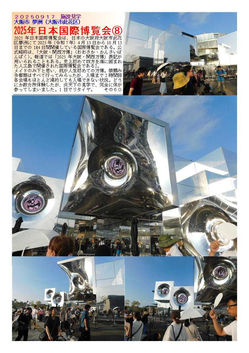 私の情報は、facebook twitter. を確認ください。「中華街を大切にする人」「ご利用する人」にはご協力をします。質問があれば、コメント欄 or sosamu@ya2.so-net.ne.jp にご連絡ください。中年おじさんの散策part2-2 から移行しています中華街の魅力は楽天ブログに今後移行していく予定です。https://plaza.rakuten.co.jp/sosamu02d/データーはライブドアーブログに掲載します。「中華街の魅力」https://sosamu02dhide.livedoor.blog/以前のデーターはアメバブログに移行しています。中華街の魅力中華街のいろいろなことを述べていきます。お問い合わせは、sosamu@ya2.so-net.ne.jp までお願いします。20250917 施設見学大阪市 夢洲(大阪市此花区) 2025年日本国際博覧会⑧2025年日本国際博覧会は、日本の大阪府大阪市此花区夢洲にて2025年(令和7年)4月13日から10月13日までの184日間開催している国際博覧会である。公式略称は、「大阪・関西万博」(おおさか・かんさいばんぱく)。報道では「2025年大阪・関西万博」表記が用いられることもある。史上初めて四方を海に囲まれた人工島で開催された国際博覧会である]。メイドのみ下と思い、我が人生初めての万博。娘頼み多都築はすべて行ってみらったが、入場まで2時間弱各会場もほとんど湯約しても入場できない状況。どうにか数カ所体験したが、炎天下の見学で、完全に体が参ってしまいました。1日でリタイヤ。