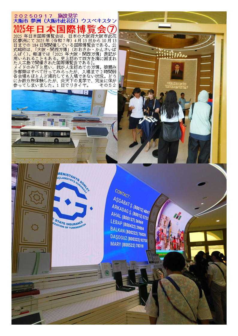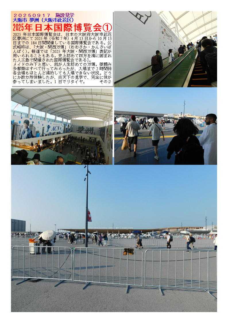 20250917 施設見学大阪市 夢洲(大阪市此花区)2025年日本国際博覧会③2025年日本国際博覧会は、日本の大阪府大阪市此花区夢洲にて2025年(令和7年)4月13日から10月13日までの184日間開催している国際博覧会である。公式略称は、「大阪・関西万博」(おおさか・かんさいばんぱく)。報道では「2025年大阪・関西万博」表記が用いられることもある。史上初めて四方を海に囲まれた人工島で開催された国際博覧会である]。メイドのみ下と思い、我が人生初めての万博。娘頼み多都築はすべて行ってみらったが、入場まで2時間弱各会場もほとんど湯約しても入場できない状況。どうにか数カ所体験したが、炎天下の見学で、完全に体が参ってしまいました。1日でリタイヤ。