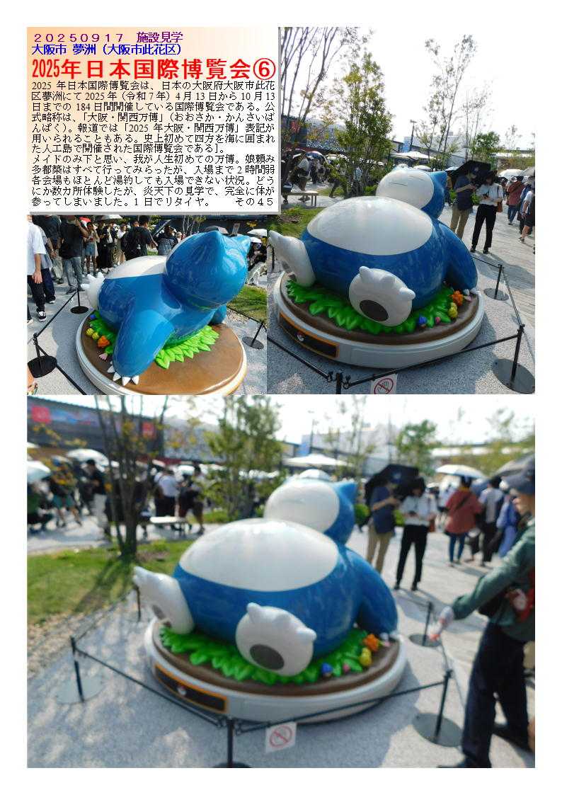 私の情報は、facebook twitter. を確認ください。「中華街を大切にする人」「ご利用する人」にはご協力をします。質問があれば、コメント欄 or sosamu@ya2.so-net.ne.jp にご連絡ください。中年おじさんの散策part2-2 から移行しています中華街の魅力は楽天ブログに今後移行していく予定です。https://plaza.rakuten.co.jp/sosamu02d/データーはライブドアーブログに掲載します。「中華街の魅力」https://sosamu02dhide.livedoor.blog/以前のデーターはアメバブログに移行しています。中華街の魅力中華街のいろいろなことを述べていきます。お問い合わせは、sosamu@ya2.so-net.ne.jp までお願いします。20250917 施設見学大阪市 夢洲(大阪市此花区) 2025年日本国際博覧会⑥2025年日本国際博覧会は、日本の大阪府大阪市此花区夢洲にて2025年(令和7年)4月13日から10月13日までの184日間開催している国際博覧会である。公式略称は、「大阪・関西万博」(おおさか・かんさいばんぱく)。報道では「2025年大阪・関西万博」表記が用いられることもある。史上初めて四方を海に囲まれた人工島で開催された国際博覧会である]。メイドのみ下と思い、我が人生初めての万博。娘頼み多都築はすべて行ってみらったが、入場まで2時間弱各会場もほとんど湯約しても入場できない状況。どうにか数カ所体験したが、炎天下の見学で、完全に体が参ってしまいました。1日でリタイヤ。