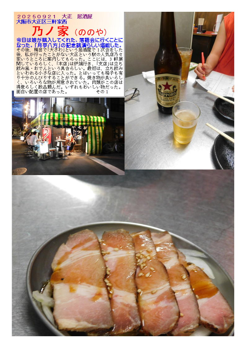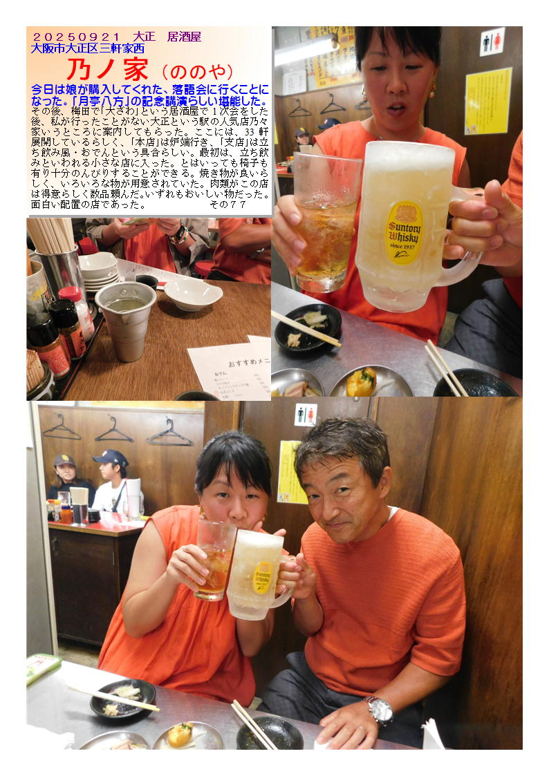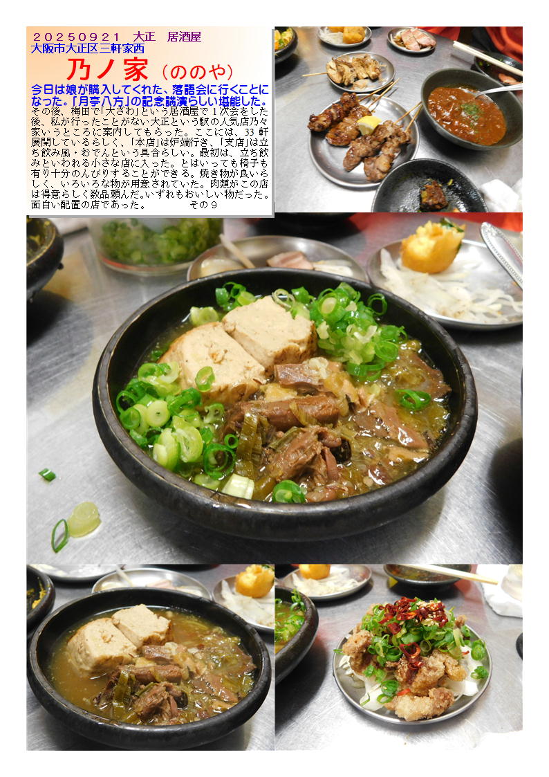 今日は娘が購入してくれた、落語会に行くことになった。「月亭八方」の記念講演らしい堪能した。その後、梅田で「大ざわ」という居酒屋で1次会をした後、私が行ったことがない大正という駅の人気店乃々家いうところに案内してもらった。ここには、33軒展開しているらしく、「本店」は炉端行き、「支店」は立ち飲み風・おでんという具合らしい。最初は、立ち飲みといわれる小さな店に入った。とはいっても椅子も有り十分のんびりすることができる。焼き物が良いらしく、いろいろな物が用意されていた。肉類がこの店は得意らしく数品頼んだ。いずれもおいしい物だった。面白い配置の店であった。